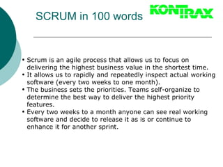 Mastering The Complete Agile Scrum Master Workshop Scrum is the agile development process that allows teams to deliver usable software periodically throughout the life of the project, dynamically absorbing change and new requirements as the project proceeds. The course covers the Agile Scrum Master Certification curriculum in detail and enables the students to clear the exam.